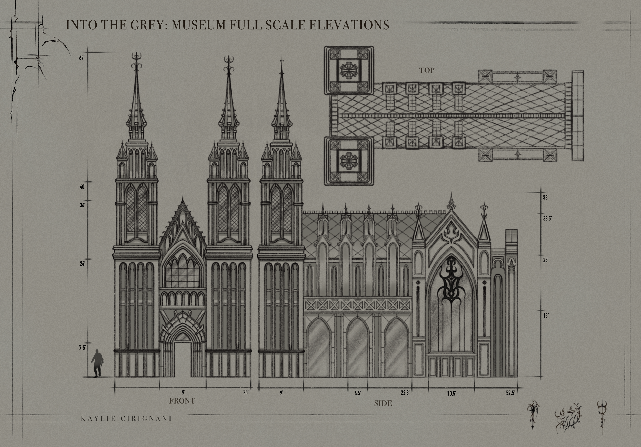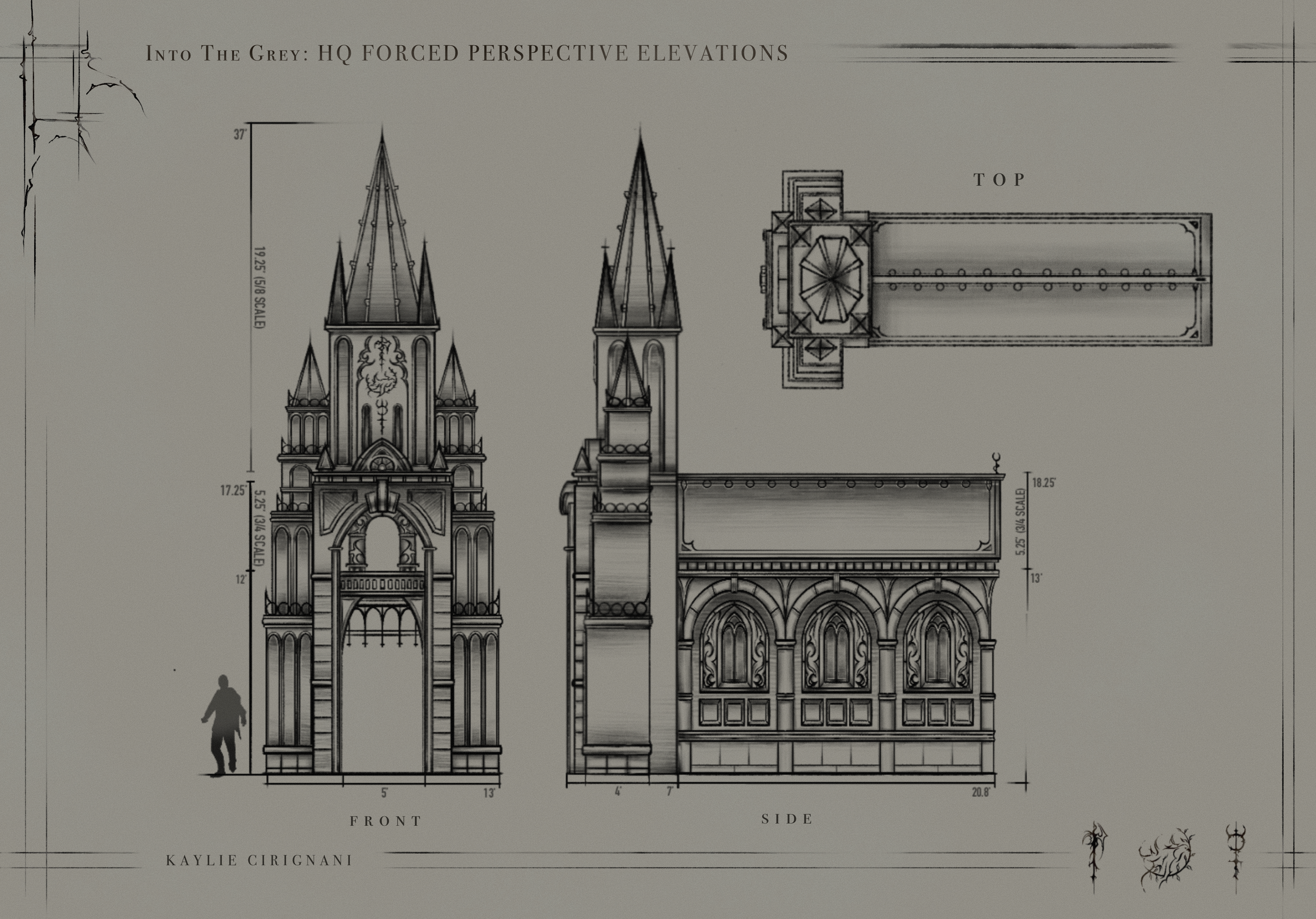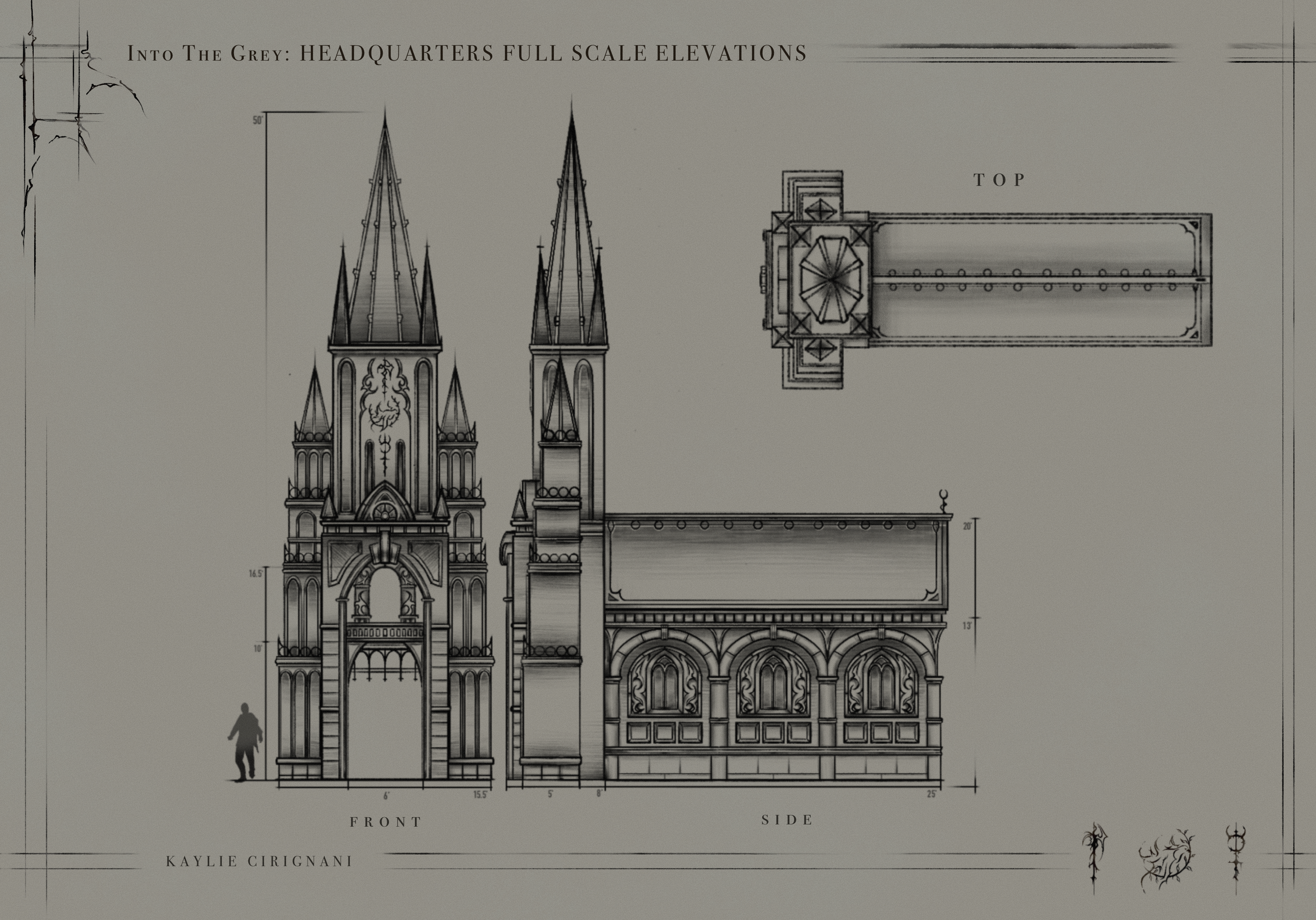 Of the locations depicted in the comic series, two of the most notable are the headquarters and the museum. To suit this redesign, I maintained the height and level of detailed intricacies through Gothic architecture. I designed the front and side elevations, as these would be the only faces visible to the audience, and included both a full-scale plan and a version in forced perspective that would be more suitable for a practical set for a sound stage.
