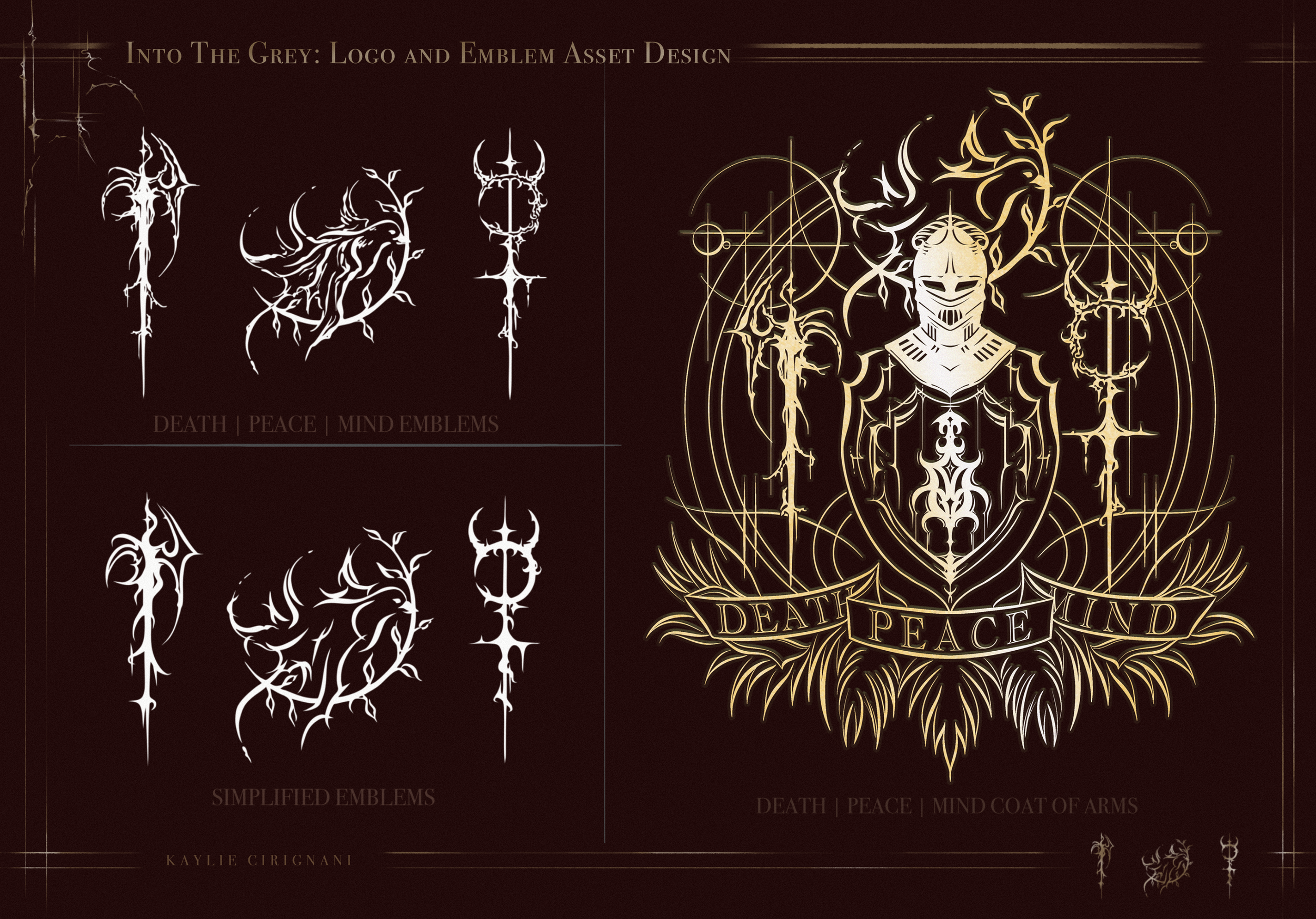 The album title, The Death of Peace of Mind, is represented by three symbols in the band’s logo: a gravestone for death, a yin-yang for peace, and an eye for mind. I wanted to make these symbols historically relevant to a medieval dark fantasy world while retaining versatility to be used across costumes, environments, and potential merchandise. I landed on a scythe to depict death, a dove carrying an olive branch for peace, and mind as the symbol of Mercury, which has historically been associated with intellect.