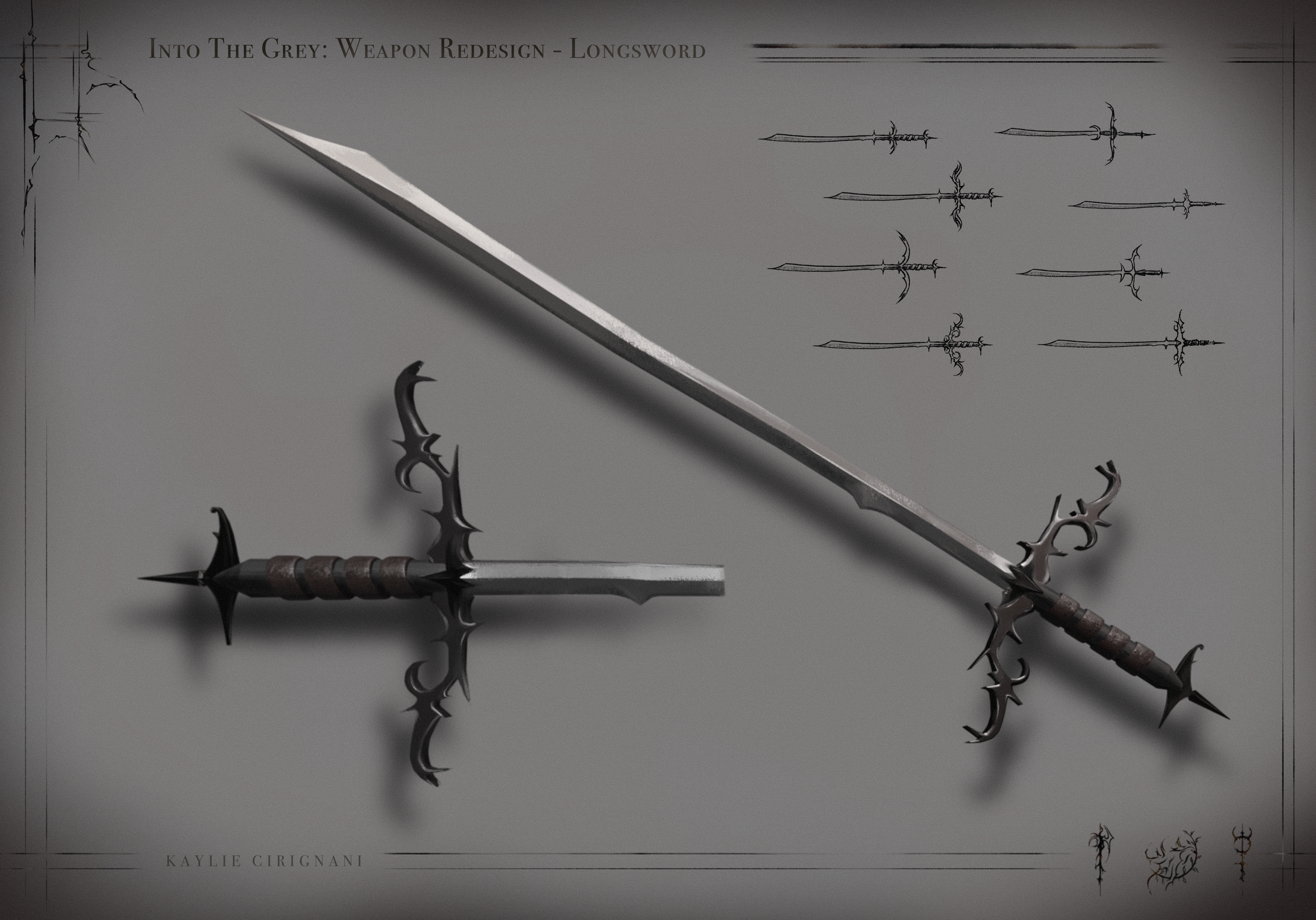 Another element that I felt essential to reimagine due to its relevance to the album’s storytelling is the weapons. In the comic series and music videos, the katana is a recurring icon. However, as the katana wasn’t brought to the Western European world that I’m depicting until centuries after the time period being represented, I developed a dual-handed longsword that was referenced from a German longsword from the sixteenth century. For the crossguard, I wanted to follow the same cybersigilism oriental-style that was used in the logos.